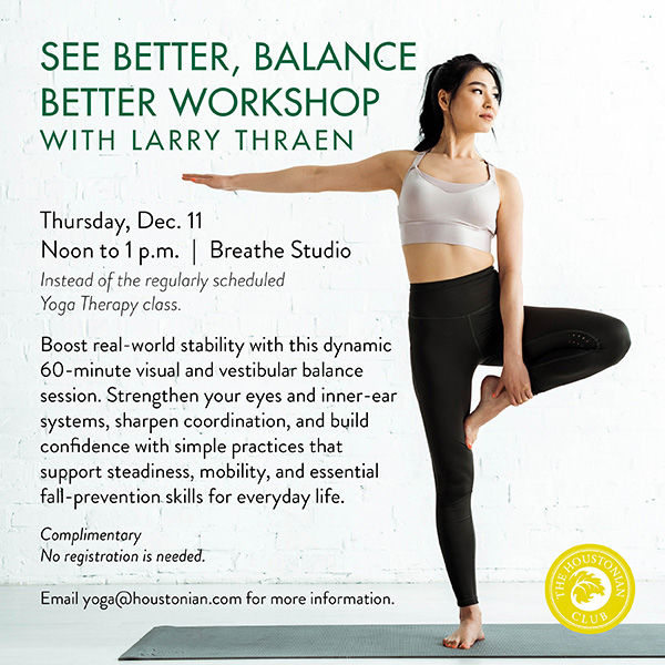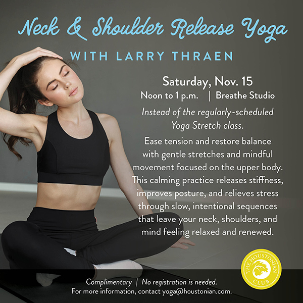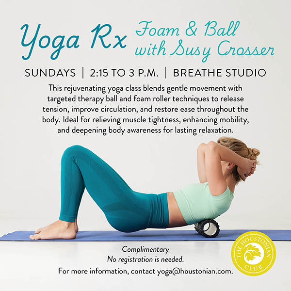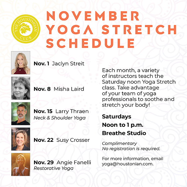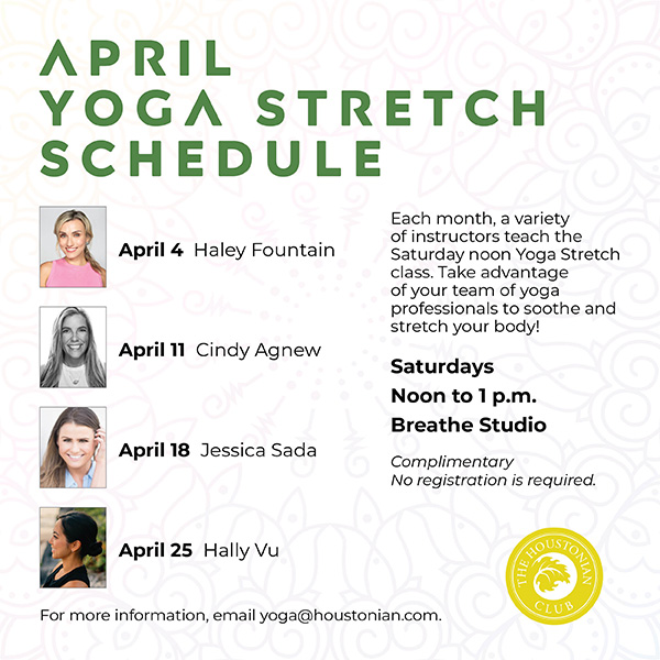To receive the yoga newsletter, emailed monthly, please email yoga@houstonian.com from your preferred email address.