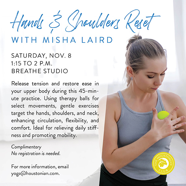 Complimentary yoga classes are available to all Houstonian Club Members along with fee-based small-group classes and one-on-one privates. Contact Yoga Program Coordinator Misha Laird with questions at 281.635.0521 or yoga@houstonian.com.