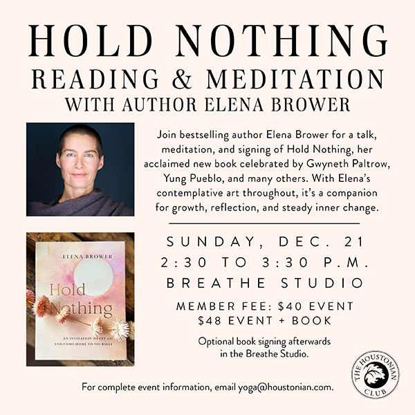 Complimentary yoga classes are available to all Houstonian Club Members along with fee-based small-group classes and one-on-one privates. Contact Yoga Program Coordinator Misha Laird with questions at 281.635.0521 or yoga@houstonian.com.